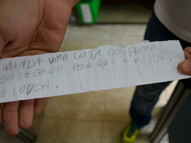 Um bilhete, escrito com um lápis, foi encontrado no alojamento do Centro Sócio Educativo de Ariquemes (Cesea) durante uma revista realizada na terça-feira (12). Escrito por um interno de 17 anos, o bilhete diz: "Manda uma conta de fumo susegado porque a peita é louca". Além do papel, foram encontrados fios, barbantes, um celular e outro pedaço de papel que dava instruções para conectar carregador de celular na energia de forma clandestina, além de lista de números de telefones.