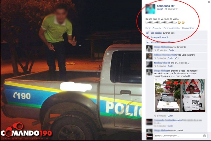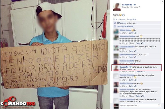 Diante da repercussão negativa que um morador de Ariquemes ganhou ao publicar uma foto em que fazia pose em cima da carroceria de uma viatura da Polícia Militar, chamando os PM’s de “Vermes”, o jovem se arrependeu e tentou apaziguar a situação, postando outra foto em seu perfil do Facebook. Desta vez, ele aparece segurando um cartaz escrito: “Eu sou um idiota que não tenho o que fazer. Fiz uma brincadeira de mal gosto. Peço perdão a PM de RO, porque a PM-RO é foda, meu irmão”. (Escrita na íntegra)