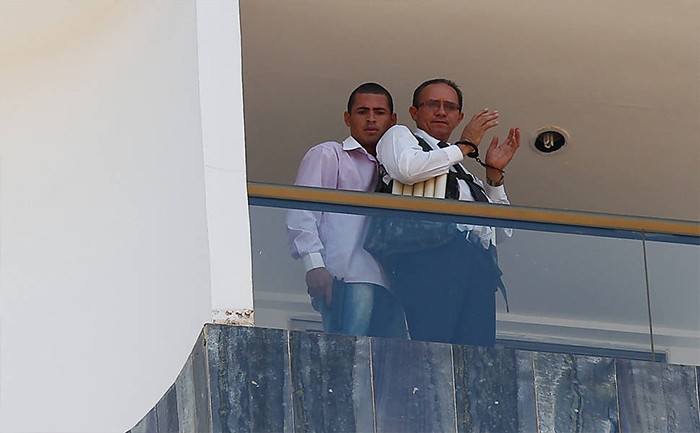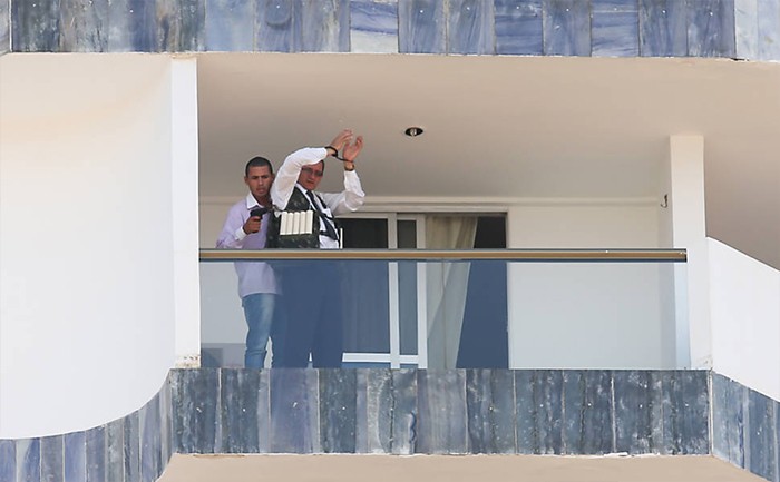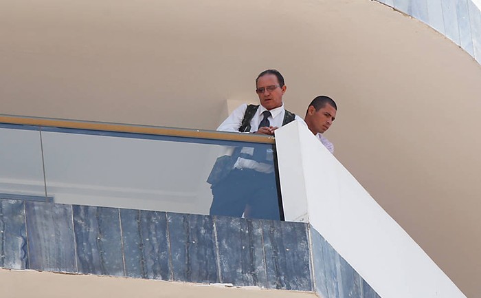 O homem, que se hospedou no St. Peter às 6 horas desta segunda-feira, está em um quarto do 13º andar do hotel e leva o refém com frequência para a sacada. O funcionário, que aparenta ter cerca de 60 anos, mostra as algemas para fotógrafos e cinegrafistas que estão em frente ao prédio.
