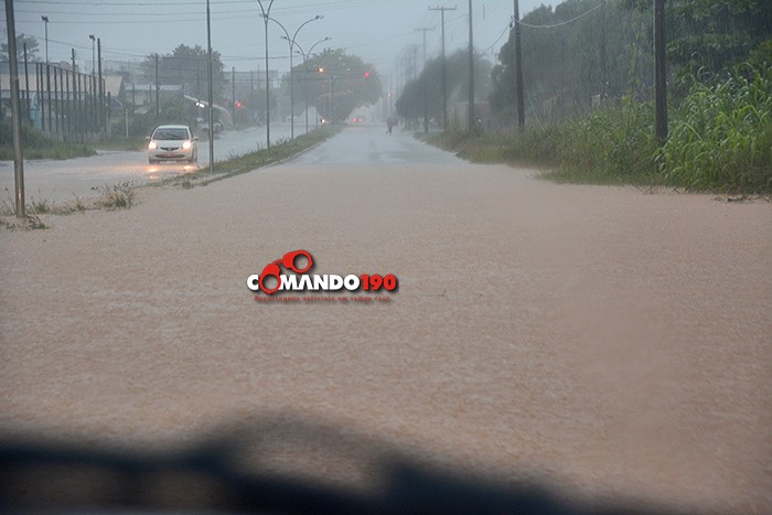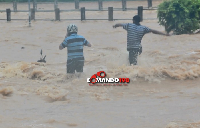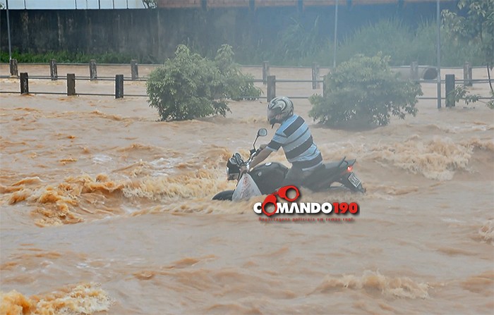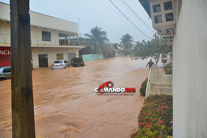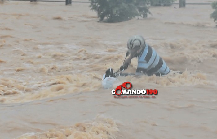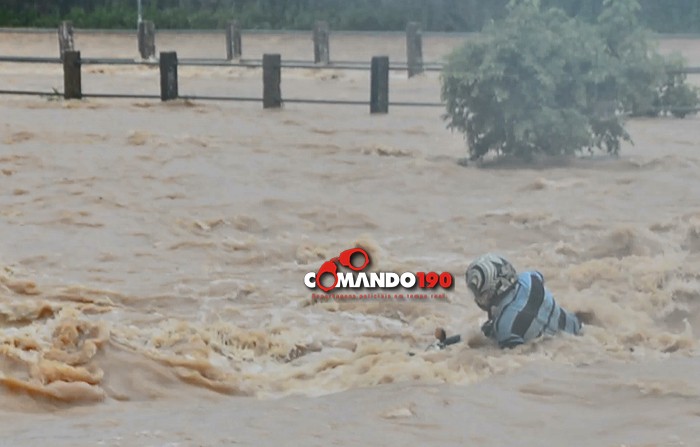 Um motociclista se arriscou e tentou cruzar o igarapé, na Rua 22 de Novembro. Sua moto desligou no meio da travessia e foi arrastada pela forte correnteza. Veja o vídeo:
