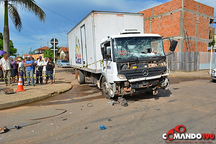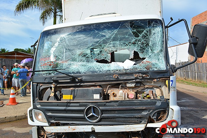 No impacto o gari foi projetado contra o para-brisas do caminhão baú e acabou sendo esmagado.