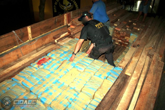 A carga estava disposta em mais de 160 fardos de aproximadamente 25Kg cada um o que totalizou 3.967Kg da “Erva Maldita”, os fardos estavam escondidos abaixo de uma carga de madeira para dificultar a descoberta do entorpecente, condutor do caminhão,'' C.L.S'', um senhor de idade avançada de Sarandi - PR, disse que pegou o caminhão já preparado em Paranhos - MS e o levaria até São Paulo e que só aceitou fazer o transporte por estar desempregado e passando por necessidades. Foi realizada vistoria e localizados sob a carga de madeira, vários fardos de nylon contendo maconha envoltos de uma lona preta. O caminhão foi encaminhado à sede do DOF, para ser conferida a carga da droga, que depois de pesada totalizou 3.964 quilos, distribuídos em mais de 160 fardo de nylon envolto a fitas adesiva.