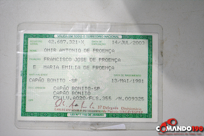 Ao chegar na casa, os PM’s se depararam com um outro indivíduo, que também apresentou um documento falso em nome de Omir Antônio de Proença. Em seu poder foram encontradas duas mochilas de roupas, uma pequena porção de Maconha e a quantia de R$ 3 mil reais.