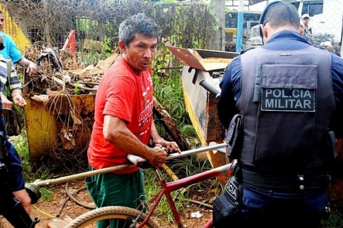 Segundo informações de testemunhas, o acusado e o comparsa abordaram um idoso embaixo do viaduto próximo a Rua Três e Meio e usando uma faca de açougueiro, roubaram da vítima uma bicicleta e uma roçadeira.Um dos bandidos fugiu na bicicleta e deixou o colega para trás.